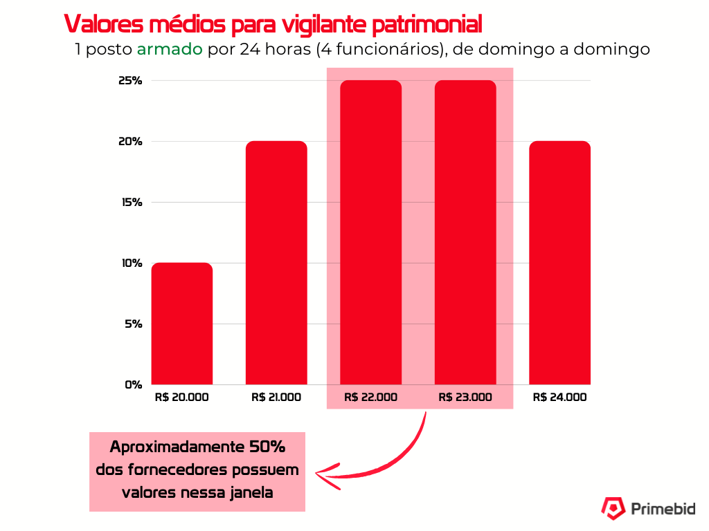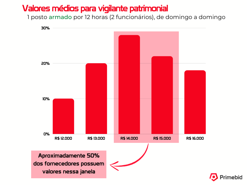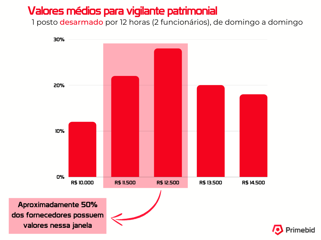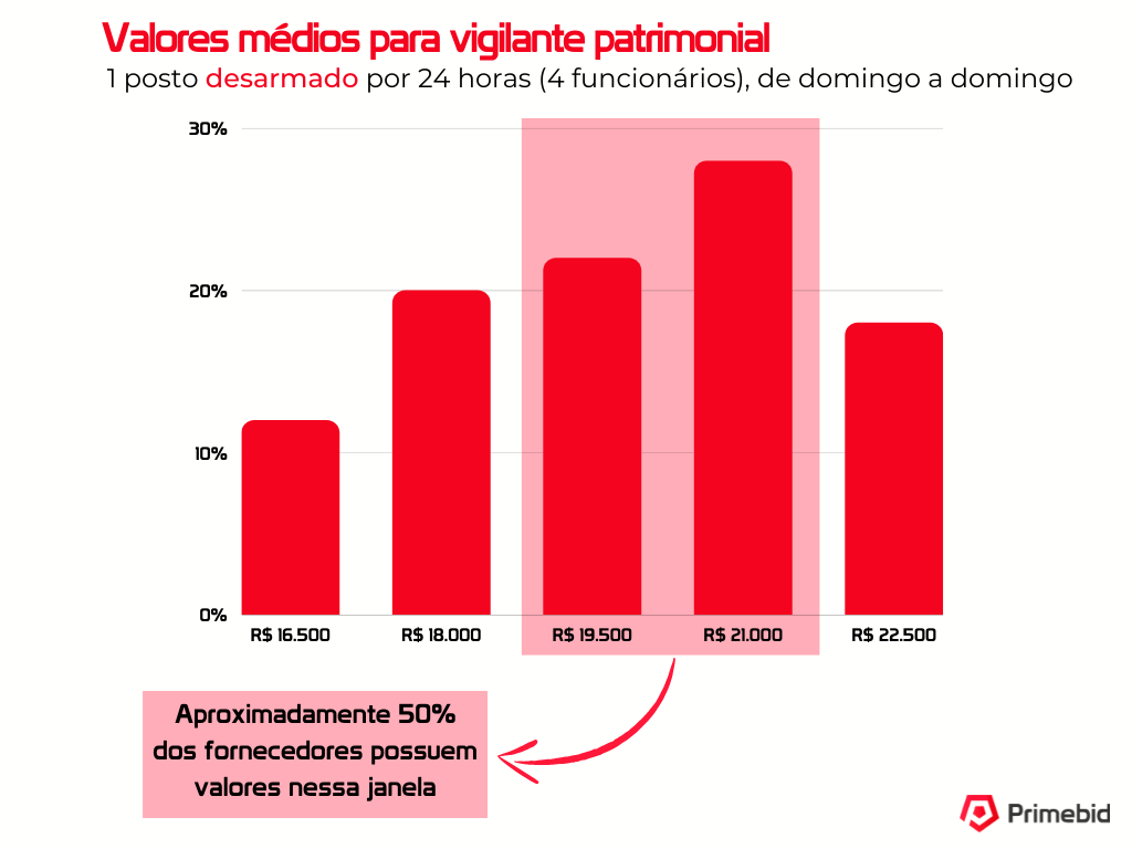 Os valores apresentados logo abaixo são baseados nos valores praticados por fornecedores da Primebid para um vigilante patrimonial desarmado por 44 horas semanais, isto é, 8 horas de segunda a sexta-feira, e 4 horas no sábado.